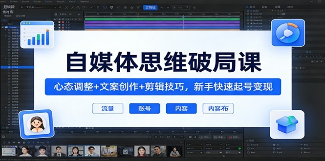 本课程为思维破局自媒体教学课,专为自媒体新手打造,聚焦创作核心痛点与破局技巧,全程理论结合实操。课程从心态总览篇切入,帮你建立正确的自媒体创作心态,规避新手误