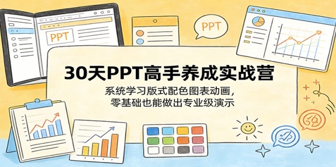 本课程为 30 天成为 PPT 高手系统实战课,从基础认知、软件操作、效率插件入手,逐步讲解封面、目录、配色、字体、版式、图表、背景等核心设计技巧,进阶掌握平滑切换、缩