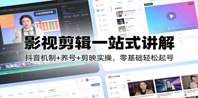 《影视剪辑一站式讲解课程》专为零基础想入局抖音影视剪辑的新手打造,涵盖从账号搭建到视频产出的完整链路,一站式解决新手所有痛点。课程先拆解抖音运作机制,详解养号