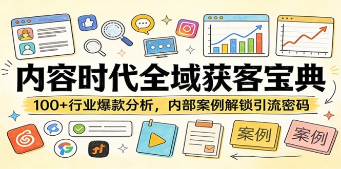 本课程为《内容时代的全域获客课》,聚焦内容时代全域获客核心,专为想通过内容实现精准引流、高效获客的从业者打造。课程包含系统实战教学,搭配 100 + 行业爆款深度分析