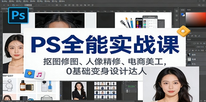 本课程为《Photoshop全能大师班》,旨在帮助零基础学员和初学者系统掌握PS核心技能,实现从软件入门到商业应用的全链路学习。课程内容覆盖PS基础认知、图层管理、选区与抠