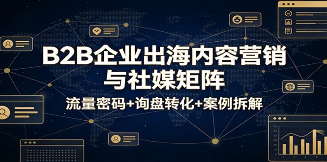 本课程聚焦 B2B 企业出海核心需求,系统讲解内容营销与社媒矩阵搭建全流程,助力企业突破海外流量瓶颈、实现询盘转化。课程涵盖出海内容营销四大核心、标签打法、流量池突