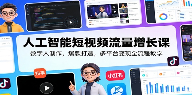 本课程为人工智能短视频流量增长课,聚焦 AI + 短视频全链路实战,从数字人制作到流量变现一站式教学。内容涵盖 AI 数字人克隆、形象与声音定制、逼真度优化,手把手教你